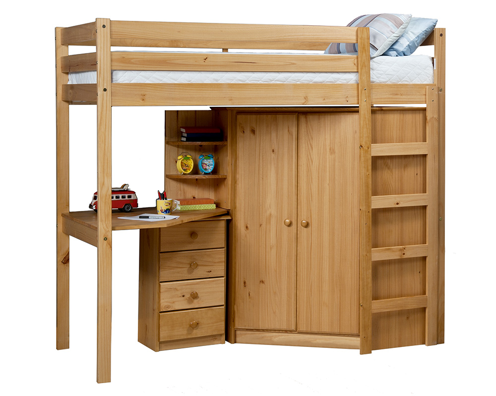 Single High Sleeper 3' 0" bed set in solid pine. Colour antique pine finish. Includes capacious corner robe with shelving and hanging space, corner desk, shelves and three drawer bedside cabinet.